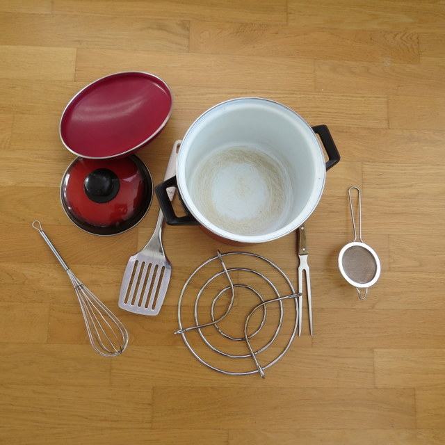 Prodam naslednjo posodo: večji emajliran lonec, cedilo za čaj, metlico za stepanje, vilice za meso, kovinski podstavek, kovinsko lopatko, pokrovko premera 17 cm.