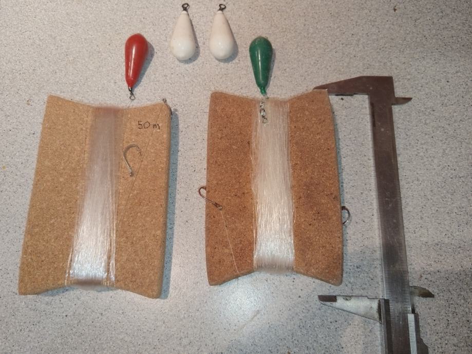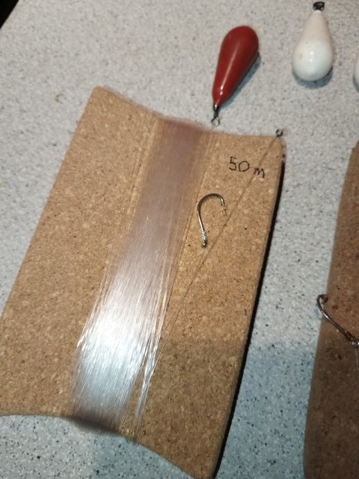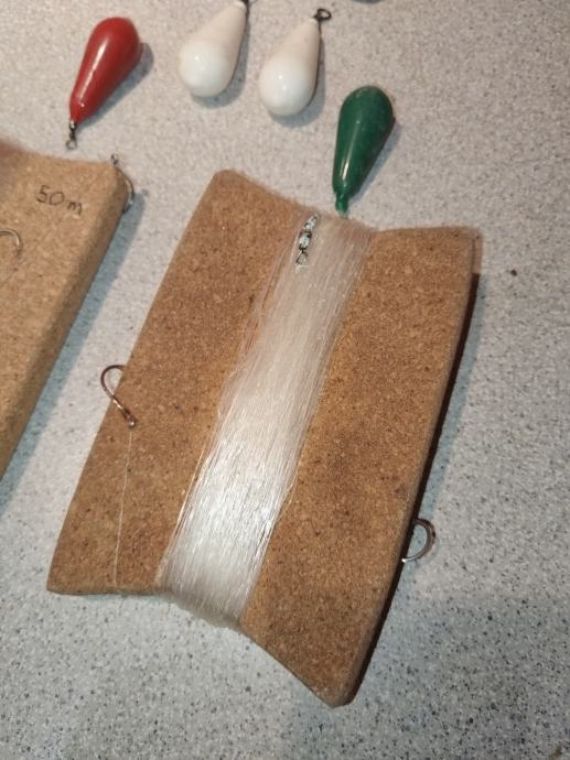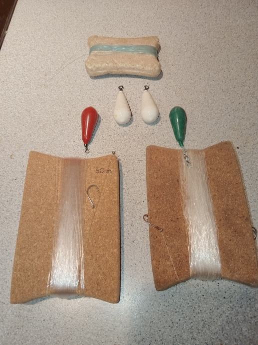 2x po 50 m navitje laksa z dvemi trnki vsak in utežjo,poleg še dve rezervni ter 1x nivetje rezervnega laksa..