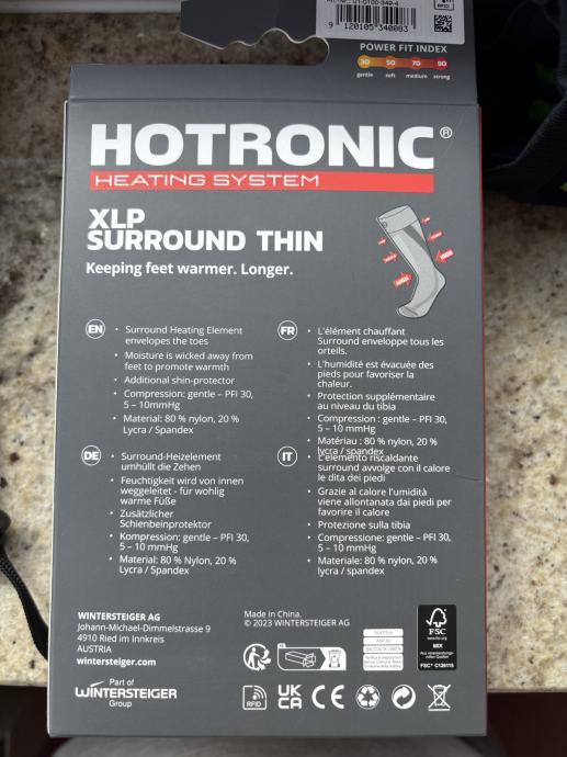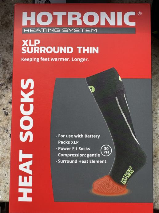 Hotronic Heat Socks Set XLP 1P BT Surround Thin so vrhunske grelne nogavice, ki vas ne bodo pustile hladne v mrzlih zimskih dneh. Primerne so za smučanje in druge športne aktivnosti v hladnejših razmerah. Narejene so iz udobnega materiala, ki vsebuje tudi merino volno in nudi rahel občutek kompresije. Material izvrstno odvaja vlago in vas ohranja suhe in udobne med aktivnostimi. Baterije, ki zagotavljajo dodatno toploto, so enostavno pritrjene na zgornjem robu nogavic. Omogočajo štiri različne nivoje gretja, ki jih lahko nastavljate direktno na bateriji. Baterija omogoča do 18,5h delovanja - odvisno od izbranega nivoja gretja. V kompletu so priloženi en par grelnih nogavic, en par baterij, polnilec in vrečka za shranjevanje nogavic.