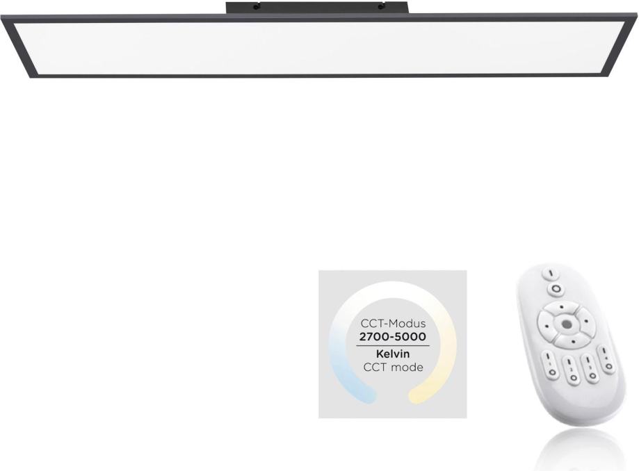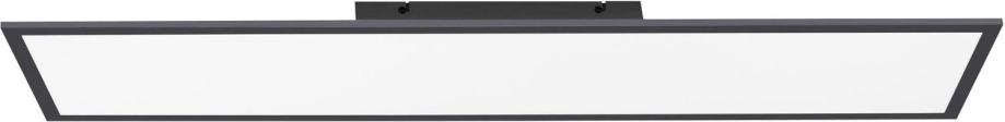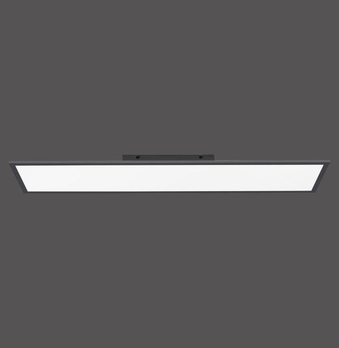 Črna stropna LED svetilka Flat prepriča s preprostim, brezčasnim dizajnom. Plošča je dolga 100 cm, široka 25 cm in dolžino visenja 5,3 cm. Vsebuje trdno pritrjeno 24-W LED sijalko. Sijalka izžareva 1750 lm in spremenljivo barvo od toplo bele (2.700 K) do dnevne svetlobe (5.000 K) ter spremenljivo jakost. Upravlja se s priloženim daljinskim upravljalnikom. Z belim steklom z umetno maso oddaja svetlobo brez odsevanja.