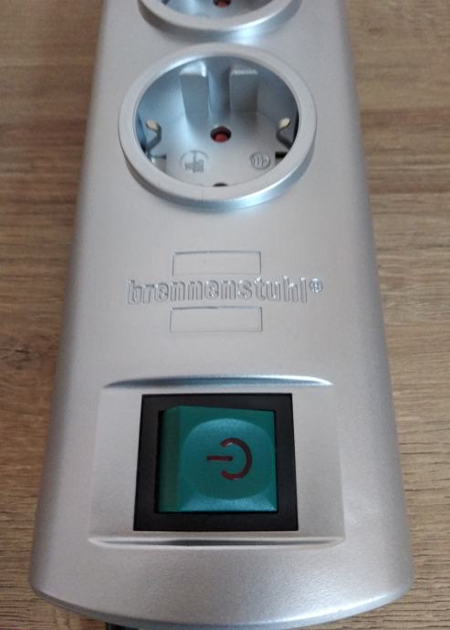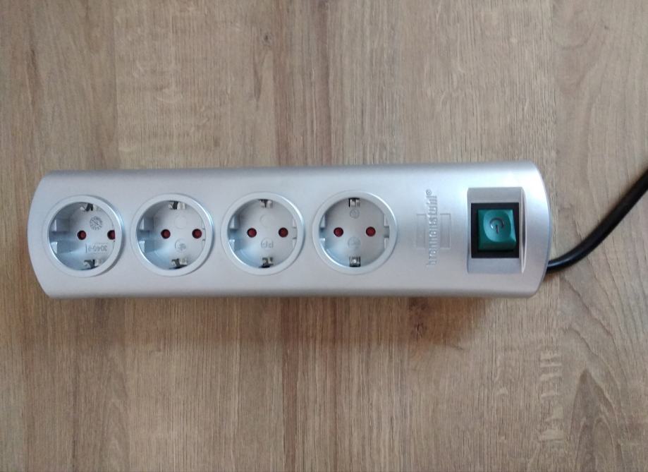 Nov, neuporabljen razdelilec oz. podaljšek v srebrni barvi, z gumbom za vklop ter vgrajeno otroško zaščito. Električni podaljšek s kablom, dolžine 1,5 m in z možnostjo priklopa do štirih naprav.