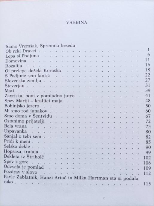Knjižico 25. pesmi za mešani pevski zbor pod naslovom "Ob reki Dravci" (skladbe na besedila Milke Hartmanove) je izdal Hanzi Artač, izdala jo je založba "Drava" v Celovcu, kartonske platnice, 144 + 4 strani + posvetilo avtorja.