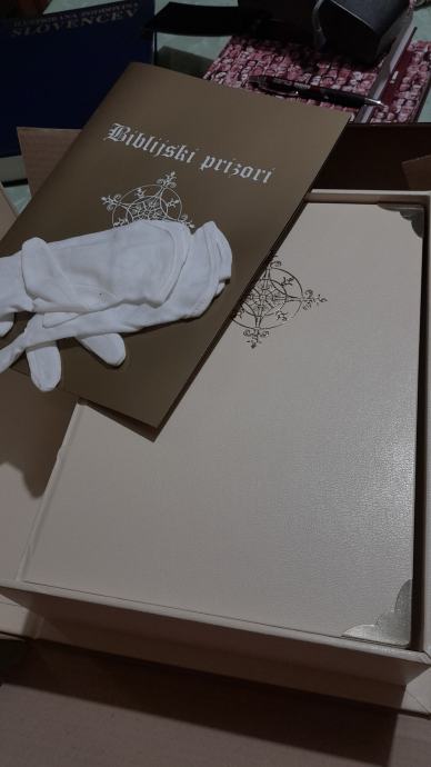 Ugodno prodam nerabljeno knjigo BIBLIJA s certifikatom kakovosti. Razkošna ilustrirana Biblija v zlati mapi Biblijski prizori. Knjiga je v usnjeni škatli, priložene so bele rokavice, izdaja Mladinska knjiga.