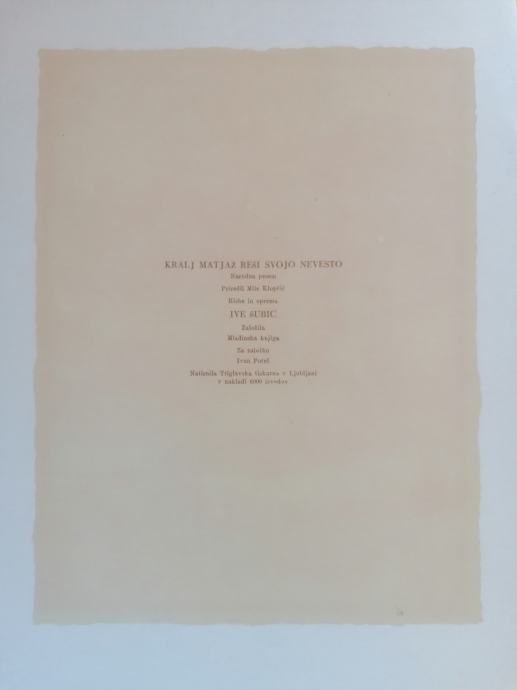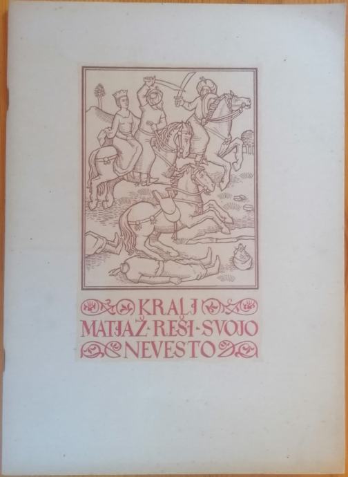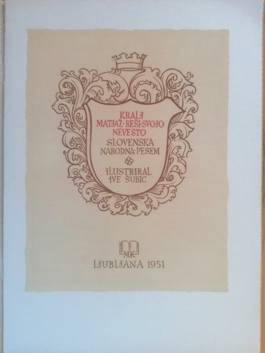 Prodam lepo ohranjeno knjižico Kralj Matjaž reši svojo nevesto v velikosti A4 formata. Gre za narodno presem, ki jo je priredil Mile Klopčič, risbe in oprema pa so delo Ive Šubica. Založil Mladinska knjiga 1951 leta.