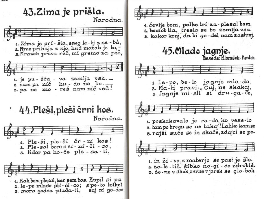 To je prvi del otroških pesmi ... z notami, vezava v kartonske platnice, 103 pesmi z notami.