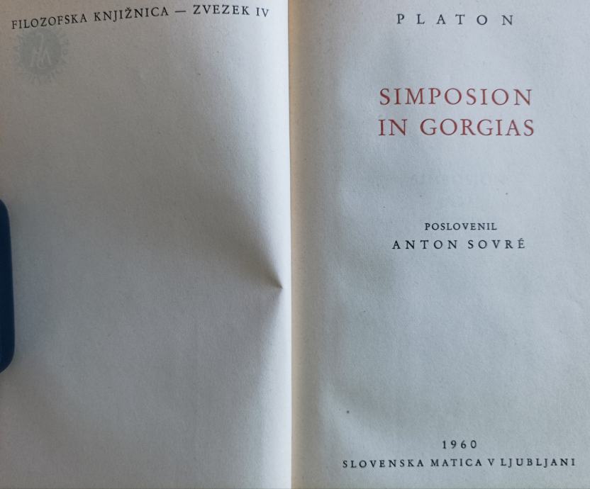 1. Platon, Simposion in Gorgias, 1960, trda vezava s ščitnim ovitkom, 311 strani, prevod Anton Sovre - 25 eur