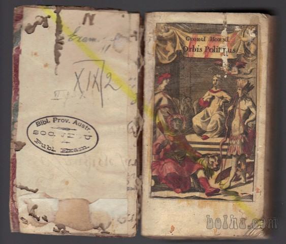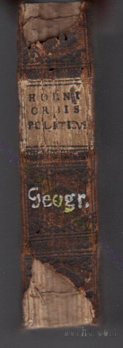 Naslov latinski knjigi je: Orbis politicus imperiorum, legnorum, principatuum, rerum publicarum - Politični zemljevid kraljestev, kneževin in javnih zadev z zgodovinskim komentarjem ter s starimi in novimi geografskimi mejami (opisane so prej napisane dežele v Evropi in Aziji ter bližnjen vzhodu pa tudi mesta na dalmatinski obali); dodatno bom pregledal še, če niso še kakšna mesta v naši okolici. Spisal jo je Georg Horn, vezava v polusnje, hrbet malo poškodovan, vezava iz časa izida knjige v letu 1669, 20 + 138 + 118 + 146 + 88 + 23 strani kazala + ročno pobarvan jeklorez + vinjeta na naslovnici, latinščina. Po dogovoru je možen ogled in dvig tudi v Ljubljani.