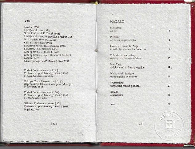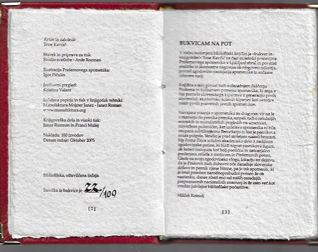 Naprodaj je še nekaj izvodov ročno tiskane in vezane bibliofilske knjižice na 33 straneh, ki govori o peripetijah, ki so se odvijale pred in ob postavitni Prešernovega spomenika v Ljubljani septembra 1905, vmes pa je še veliko ilustracij in podob. Prijatelj Janez Rozman (Mojster Janez) mi je stare ničvredne knjige, ki sem mu jih prinesel, zmlel, dodal bombažne delce in zajel nov papir, na katerega se je ta reč tiskala na stari repliki Gutenbergove stiskalnice. Vezala se je, knjižica namreč, v rdeče usnje, ki sva ga z Janezom pripeljala iz takrat še delujoče tovarne usnja na Vrhniki. Mojster je s Češke prinesel še kovinske vogalnike za robove, po vezavi, ki je bila tudi izpod rok starejšega knjigoveza pa sem še sam dodal vsaki knjižici na usnje po dve zlati vinjeti, naslovnica pa je bila v globokem tisku. Ob koncu projekta pa je še kolega kaligraf vpisal številke od 1 do 100, kolikor je bilo tudi natisnjenih in nato se je ta bibliofilska zgodba končala.