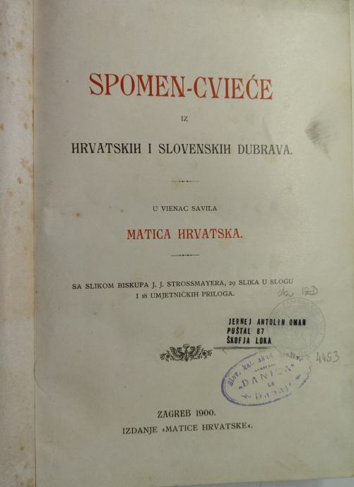 Naslov Spomen-cvieće iz hrvatskih i slovenskih dubrava : sa slikom biskupa J. J. Strossmayera, 29 slika u slogu i 18 umjetničkih priloga / u vienac savila Matica hrvatska