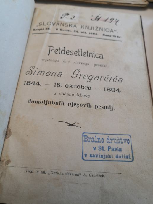 - Petdesetletnica rojstnega dne slavnega pesnika Simona Gregorčiča z dodano izbirko domoljubnih njegovih pesmijo - 1894 - 100€, - NI VEČ!!,