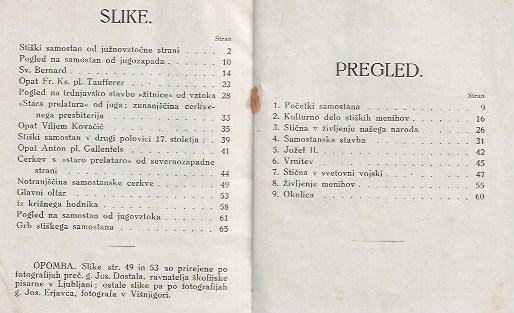 Črtice o cistercijanskem samostanu Stična so vezane v kartonske platnice, 64 + 4 strani + fotografije, podobe, tabele.