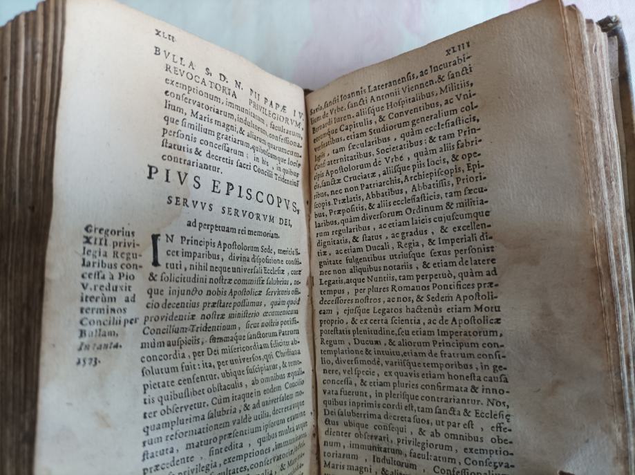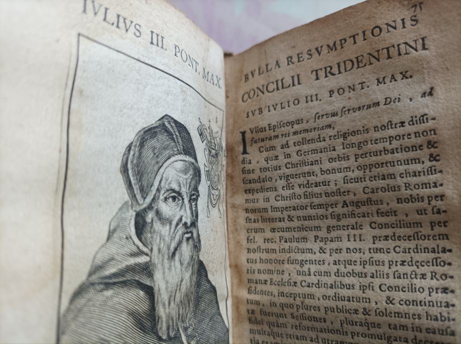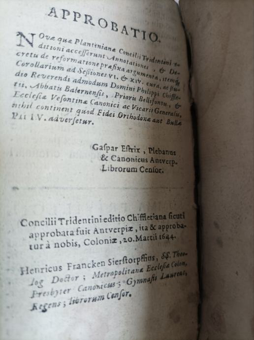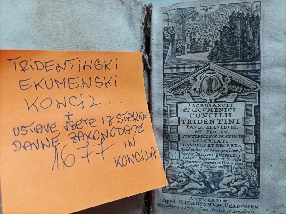 Tridentinski ekumenski koncil in ustave vzete iz starodavne zakonodaje in koncila, 1677, vezava v nekdaj belo usnje, 24 + 287 + 60 + 74 strani + naslovna ilustracija in še tri med tekstom (3-je nekdanji cerkveni dostojanstveniki), vinjete.