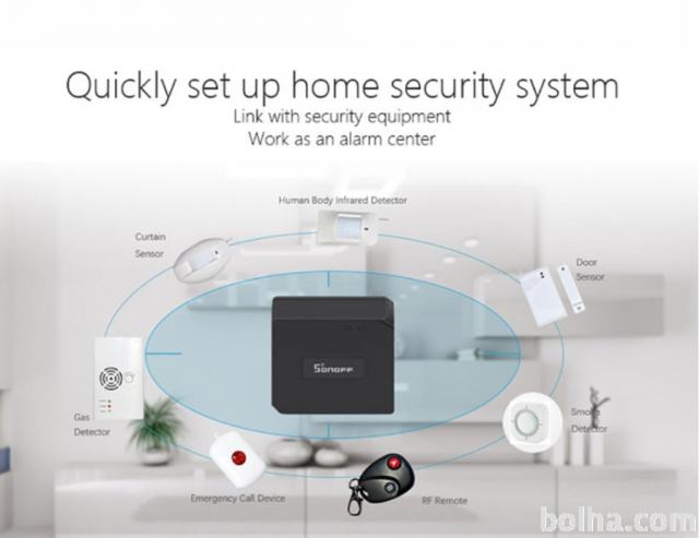 SonOff osnovni varnostni komplet z centralo RF433, ki je kompatibilna z ostalo opremo SonnOff avtomatizacije priložen je RF PIR2 senzor gibanja, RF elektromagnetni senzor za vrata in okna DW1 ter RF daljinski upravljalec. Alarmni set ima z senzorji centralo RF Bridge 433MHz, ki se v sistem poveže preko WiFi brezžične komunikacije signalov za ostale SonOff krmilnike ali Smart Home Google ali Amazon Alexa sisteme.