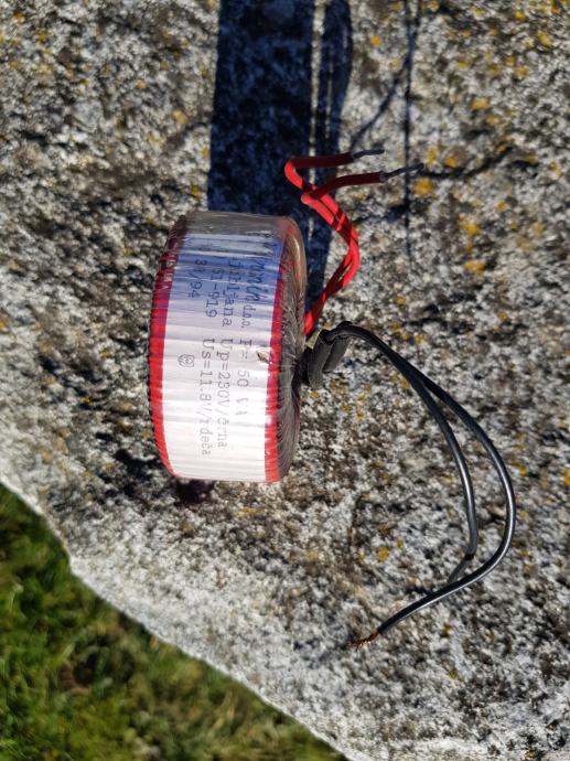 Toroidni transformator - obročasto jedro proizvajalca HITELEKTRONIK d.o.o. ima moč 50VA, vhodno primarno napetost 230V ter izhodno sekundarno napetost 12V. Brezhibno, nerabljeno, ugodno - po manj kot polovični ceni.