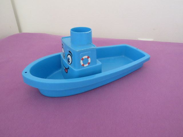 Prodam otroško igračo ladjo, ladijco, modre barve z narisanim obrazom, modre barve, na vsaki strani ima luknjico za pritrditev vrvice, dolžina: cca. 35 cm.