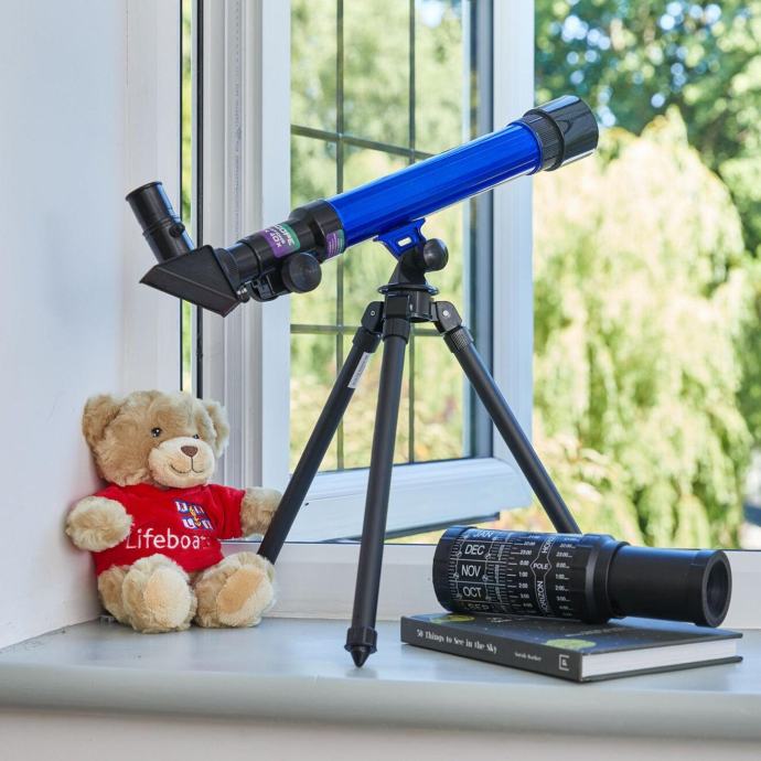 Popolna igrača za bodoče astronome. Teleskop z izmenljivimi lečami različnih jakosti (20x, 30x, 40x). Teleskop ima stojalo, ki ga je mogoče vrteti za 360 stopinj. Stojalo je tudi nastavljivo po višini.