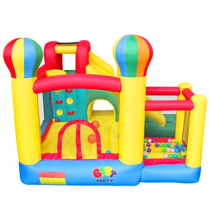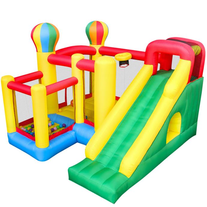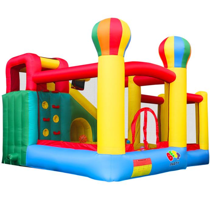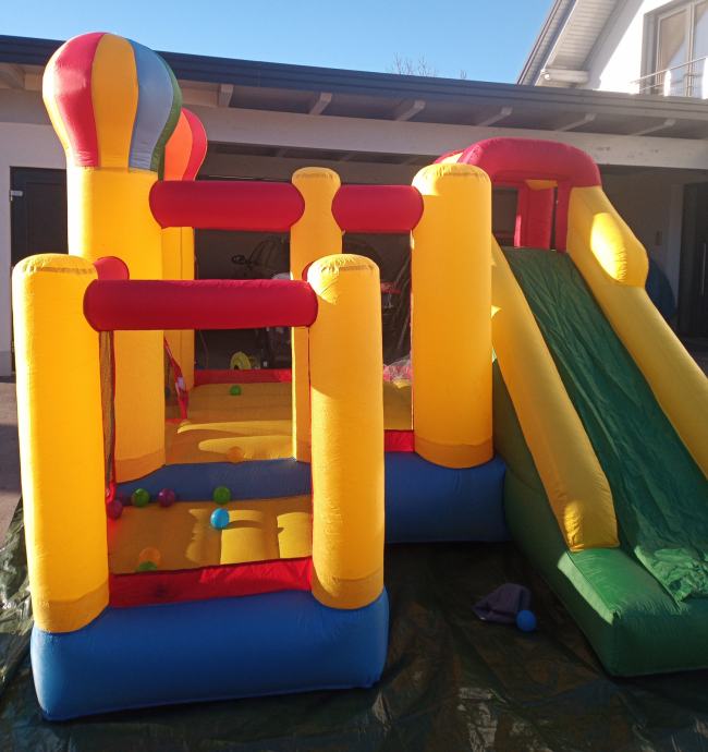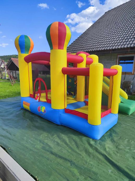 Napihljivo igralo ima veliki tobogan, plezalno steno, veliko skakalno površino in koš.