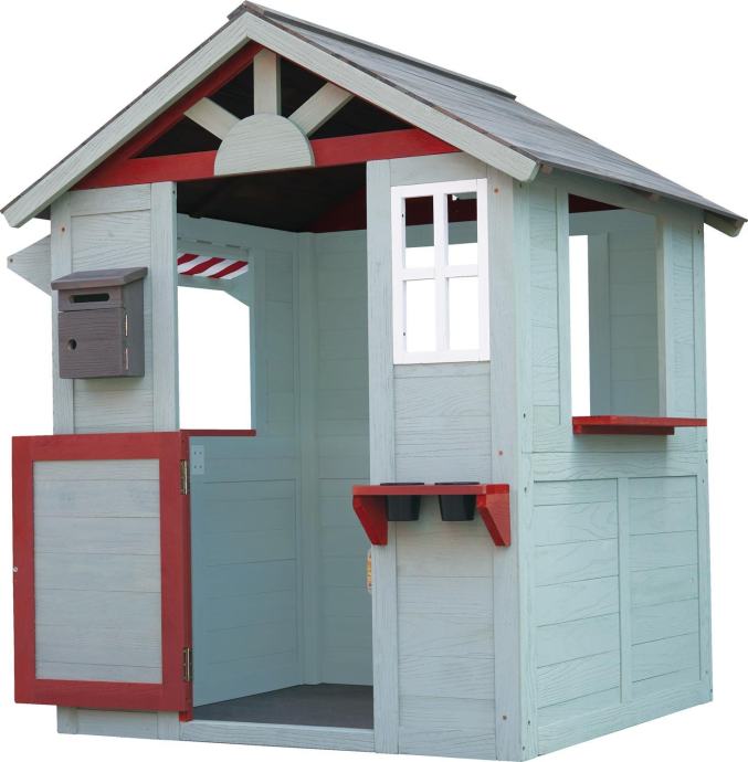 V igralni hiški iz FSC® jelke se lahko otroci umaknejo in pustijo svoji domišljiji prosto pot. Izdelek, izdelan iz visokokakovostnega lesa s premazom na vodni osnovi, je opremljen z okni, poštnim nabiralnikom in vrati, ki jih je mogoče zapreti s zapahom. Poleg tega zajema dva cvetlična lonca iz stabilne plastike ter odprto servirno postajo z rdeče-belo črtasto markizo. Igralno hiško se s pomočjo montažnega kompleta preprosto in hitro postavi.
