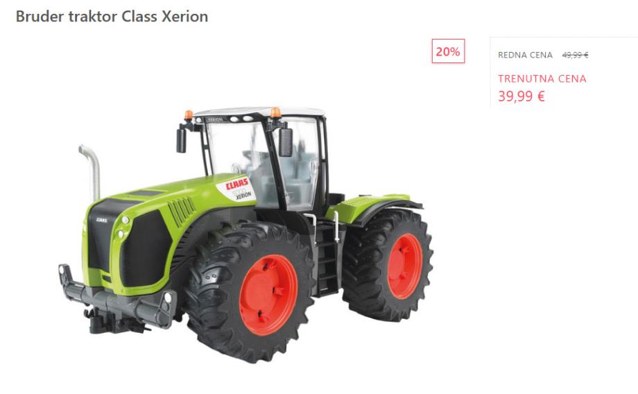 Zaradi neuporabe prodamo Bruder Traktor CLAAS XERION 5000 kat.št. 03015 , proizvajalec Bruder. Popolna replika v merilu 1:16. Izdelano iz visoko kakovostne plastike. Dimenzije: 42x19x22,5 cm. Okolica Brežic-Krško (včasih možno tudi do Novega mesta ali Ljubljane) - info na 070-773-644