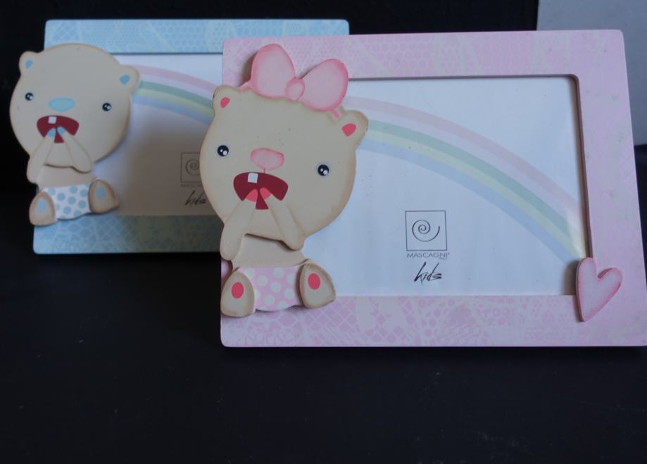 Okvir je lesen in tudi medvedka sta lesena.