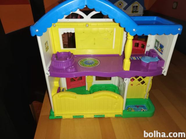 Fisher price hiša, z veliko zvočnimi efekti (zvonec, straniščna školjka, telefon, oglašanje živali (kuža, muca)), na oknih se premika, eno okno je sonce, drugo luna. Sem iz Maribora.