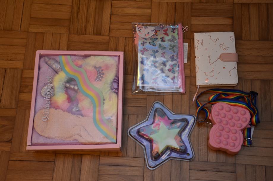 Prodam komlet rtvari za dekleta, vse je novo, nerabljeno: zvezde, ki se svetijo v temi, rokovnik, set za pisanje (nalepke, svinčnik...), pop-it torbica, set za "lepotičenje". Cena za komplet 10 eur.