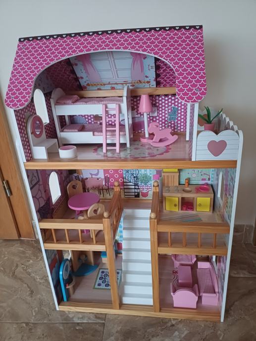 Prodam leseno hiško za majhne punčke. Velikost 60x30x90. Hiška je opremljena z vsemi dodatki, kar je razvidno iz slike.