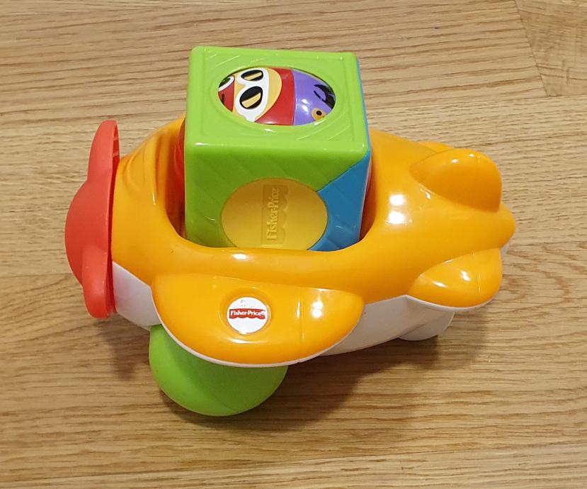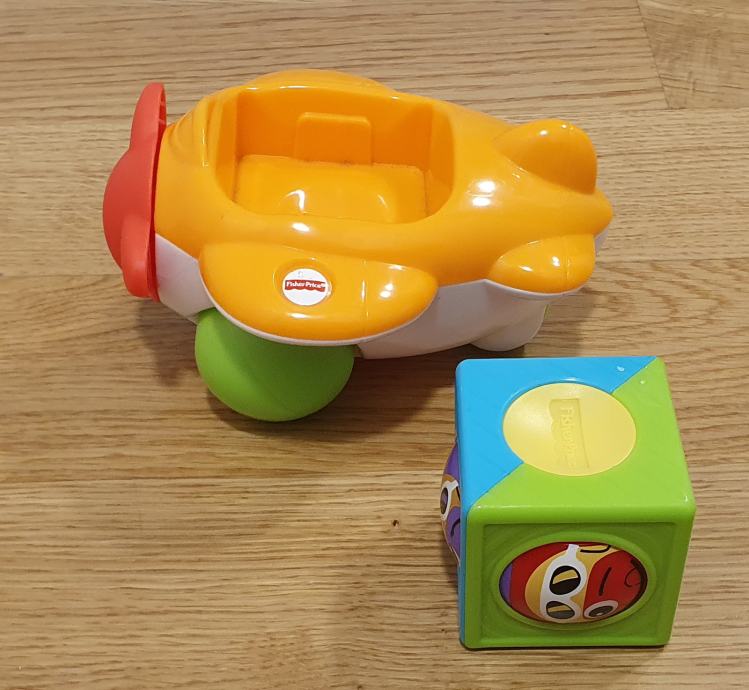 Prodam igračo letalo s kocko znamke Fisher Price. Letalo ima koleščka, ko se vozi se premika propeler, na kocki pa se vrti slikca.