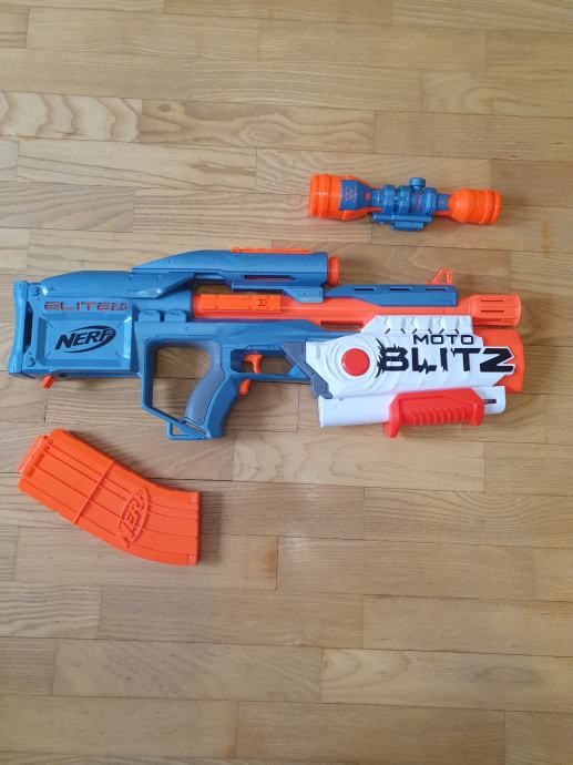 zelo malo rabljena nerf puška moto blitz. Električna puška ki ima 10 metkov v kalibru in 6 v pumpi. Lahko ustreli kar 6 metkov z enim pritiskom na gumb nato pa še 10 metkov z elektriko.