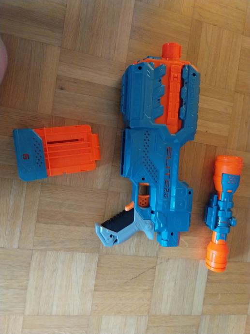 polavtomatska električna puška skupine elite 2.0 ima seržer za 6 metkov .Priloženo vse na zgornji sliki. Metki niso priloženi