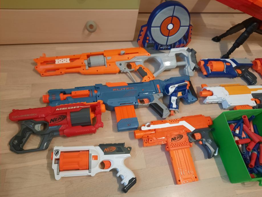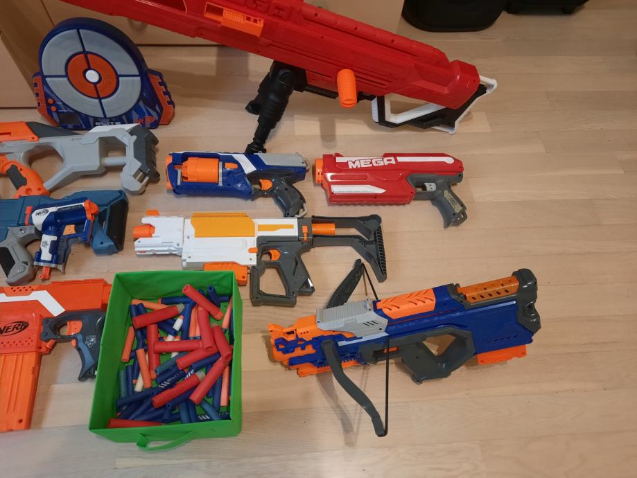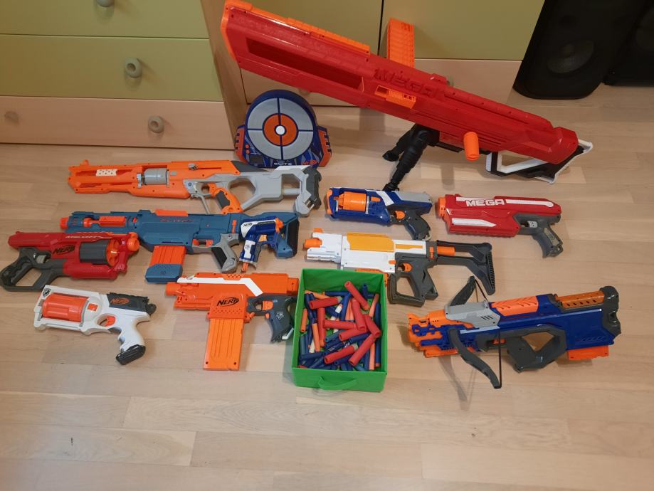 Prodam komplet 10 pušk "NERF" s električno tarčo in nekaj penastih nabojev. 9 pušk je klasičnih na napenjanje in 1 električna. Vse puške so lepo ohranjene in popolnoma izpravne.