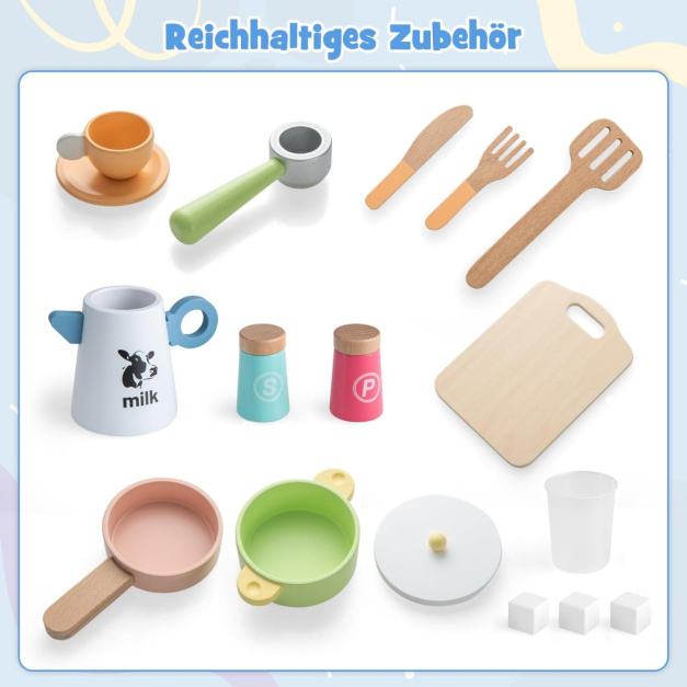 Lesen igralni kuhinjski set ponuja otrokom poglobljeno kuharsko izkušnjo z različnimi področji. Poleg tega bogata posoda zagotavlja veliko udobje. Z veliko prostora za shranjevanje ta igralna kuhinja za malčke spodbuja razvoj dobrih organizacijskih navad. Na voljo je tudi odstranljiva polica za predmete različnih višin. Poleg tega so zanesljive plošče zaradi varnosti polirane do zaobljenih vogalov. Kot odlično darilo za otroke, stare 3 leta in več, ta lesen igralni kuhinjski komplet spodbuja kognitivne sposobnosti, praktične spretnosti in socialno interakcijo. Prav tako lahko sodelujejo in uživajo v čudovitem času med starši in otroki.