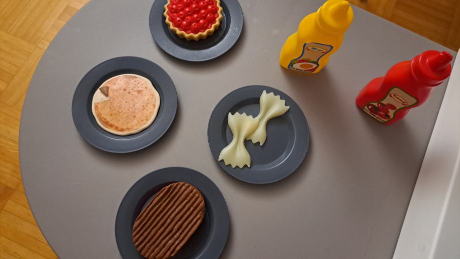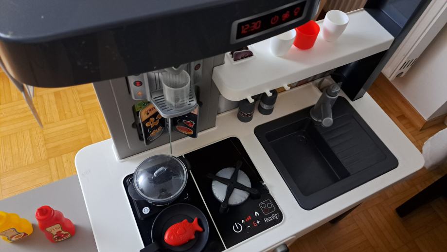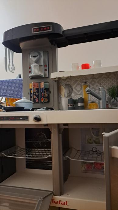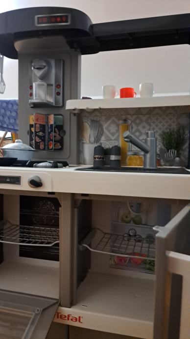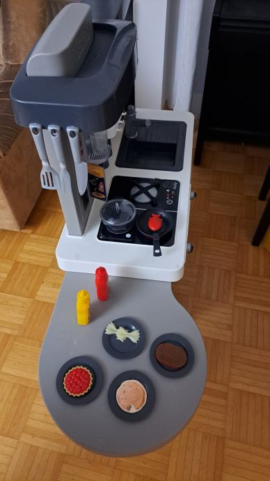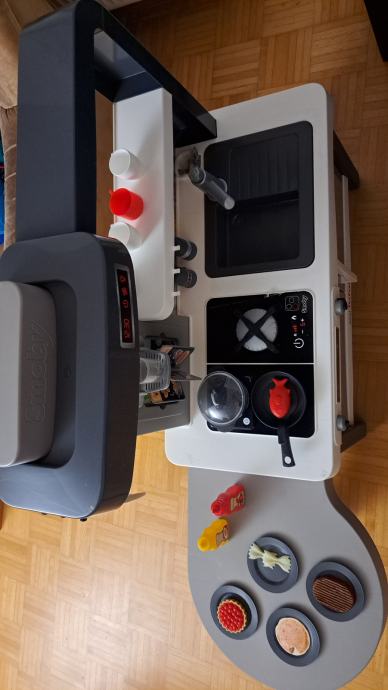 Prodamo dobro ohranjeno kuhinjo za igranje Smoby Tefal Evo. Kuhinja ima nekaj dodatkov - krožnike, pribor, skodelice, ribo, zrezek, korenje... Skozi pipo lahko teče voda, saj je v kuhinjo vgrajena mehanska črpalka.