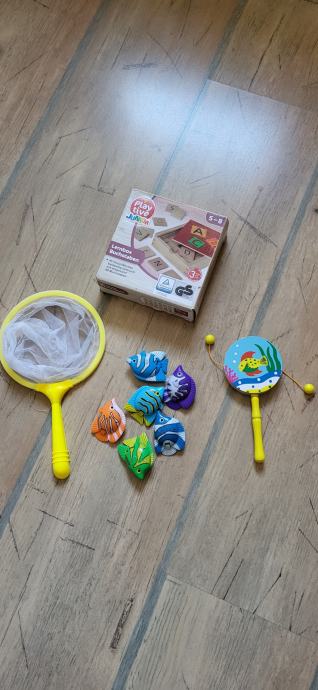 mreža in ribice 4 eur, lesena abeceda 5 eur, ropotuljica ribice 3 eur, cene brez ptt