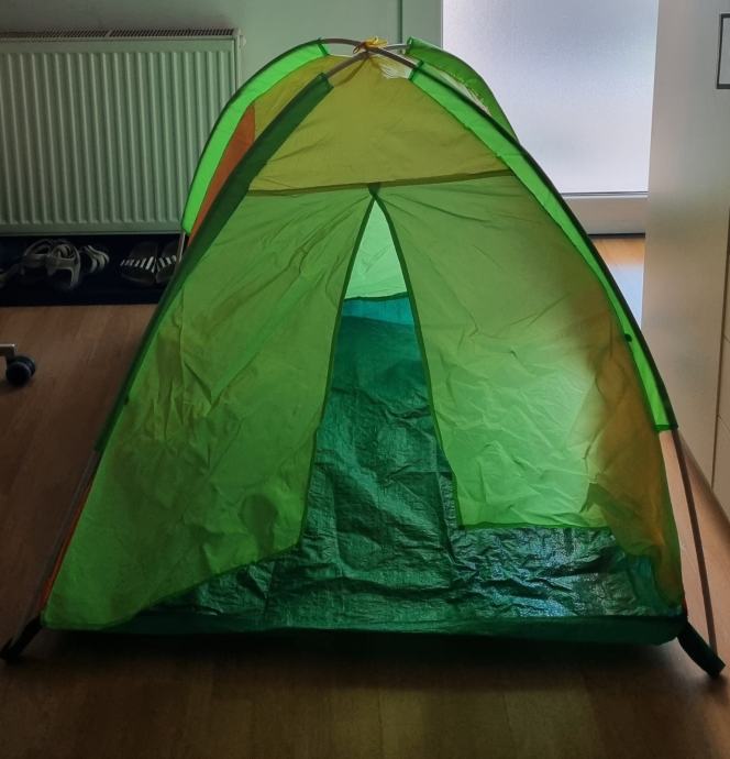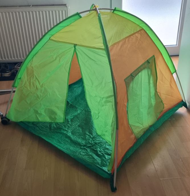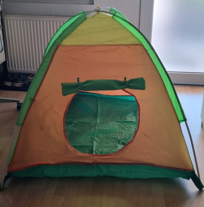 Prodamo otroški šotor, ki je namenjen otroški igri. Primeren je za uporabo zunaj ali v stanovanju. Prevleka ni vodoodporna, zato ga ni primerno puščati zunaj na dežju. Je skoraj kot nov. Kličite prosim le resni kupci.