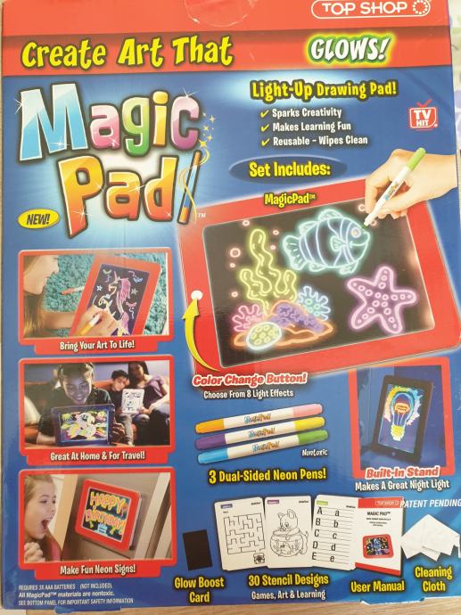 Lepo ohranjena risalna tabla Magic pad za zabavo in ustvarjanje s 30 šablonami/nalogami (črke, številke, oblike,...)...tablica sveti v različnih barvah...cena je 8€