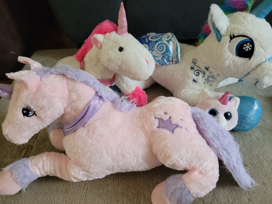 Samorog, pliš igrača: zadnji v vrsti, bel, zelo velik, z modrim rogom. Lepo ohranjen.