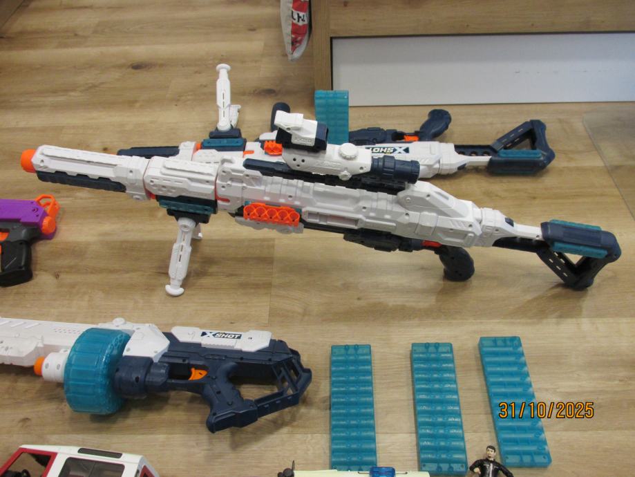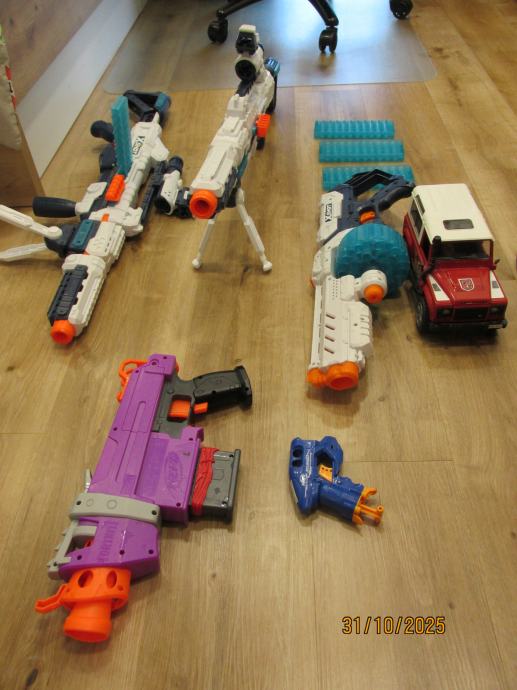 Prodajamo otroške puške in pištole x-shot in nerf, ter bruderjeva avtomobila in motorne sani. Vse puške delujejo in niso poškodovane možen preizkus dodamo tudi nekaj penastih nabojev. Prodajamo komplet za 70eu lahko tudi posamezno. Komplet vse kar je na slikah. Lahko pošljem tudi po pošti.