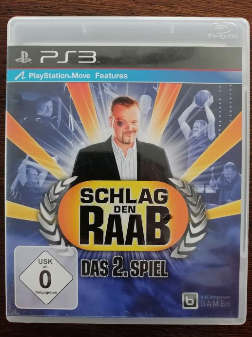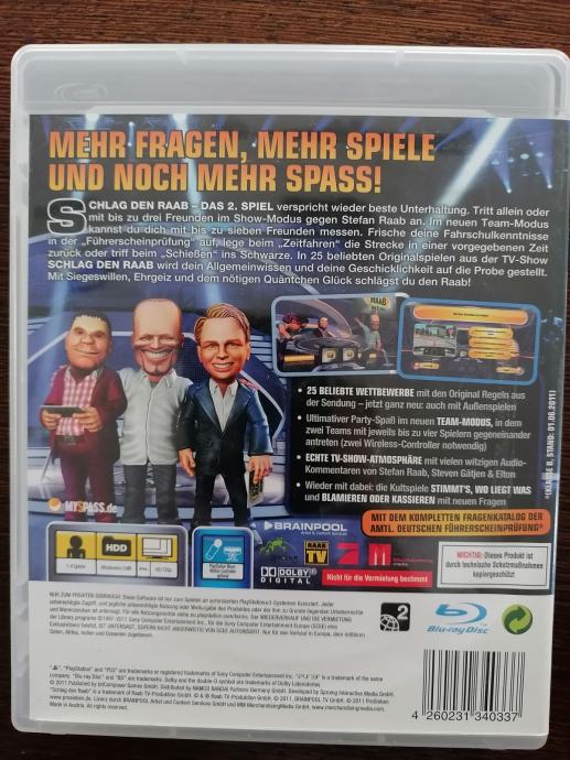 Prodam igro za Playstation 3: Schlag den Raab - Das 2.Spiel. Gre za kombinacijo kviza in zanimivih TV iger po vzoru izjemno priljubljenega nemškega TV formata - oddaje Schlag den Raab.
