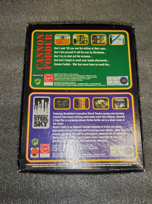 Prodam dve igri v eni škatli: Cannon Fodder in Beneath a steel sky. Na slikah lahko preverite vsebino in stanje škatle.