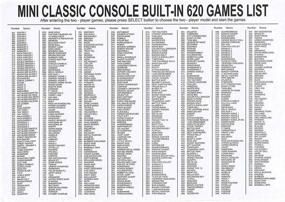 - V paketu je 620 prednaloženih iger, dva žična krmilnika in AV kabel za enostavno povezavo s televizorjem.