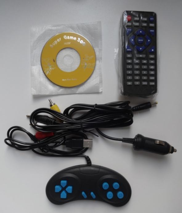 Legendarni CD plošček z igricami Super Game 300, skupaj z igralno konzolo in priključnimi kabli.