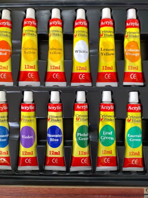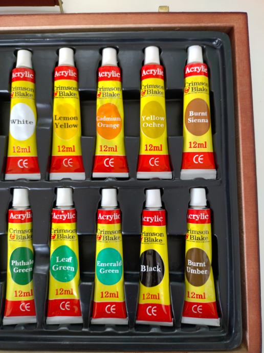 Na prodaj je set neuporabljenih akrilnih barv za slikanje Crimson & Blake v leseni skatli. Skatla ima tu in tam znake hranjenja, a drugace je set kompleten s copici, svincniki, radirko, barvami.......
