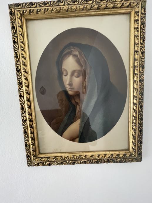 Prodam okvirjeno sliko svete Marije v zlati barvi okvirja dimenzija 35x30cm.