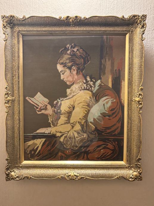 Prodam čudovit ročno izdelan tapiserijski gobelin z motivom ženske, ki bere knjigo. Gre za klasičen, priljubljen motiv iz 18. stoletja, narejen v tehniki needlepoint / vezenine.