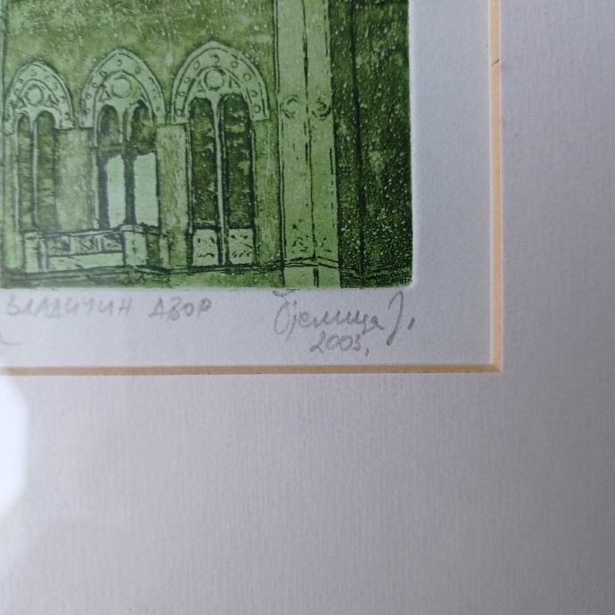 Prodam grafiko Škofijska palača v Novem Sadu. Ima podpis slikarja leto 2003. Št. 29/60. Napis na slike Vladičin dvor. Velikost okvirja 23,5x25,5 cm.