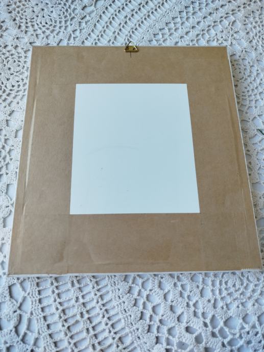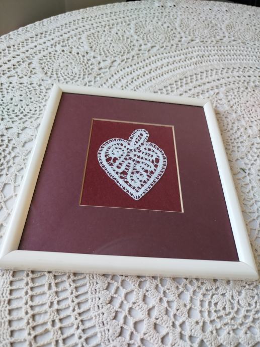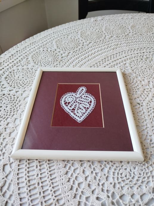 - Idrijska klekljana bela čipka "List", izdelana natančno, na bordo podlagi, v okvirju