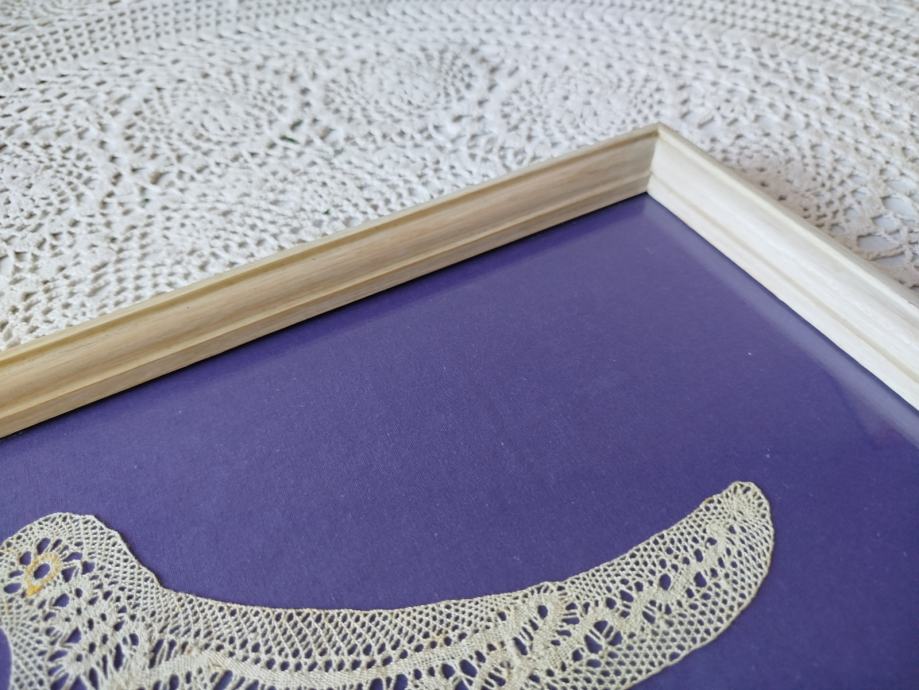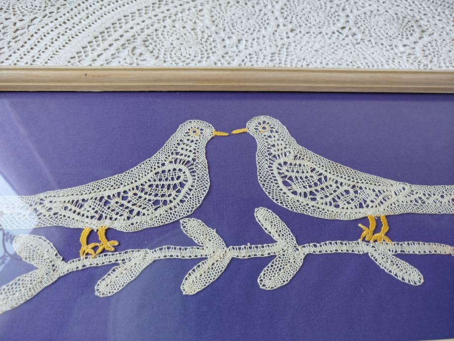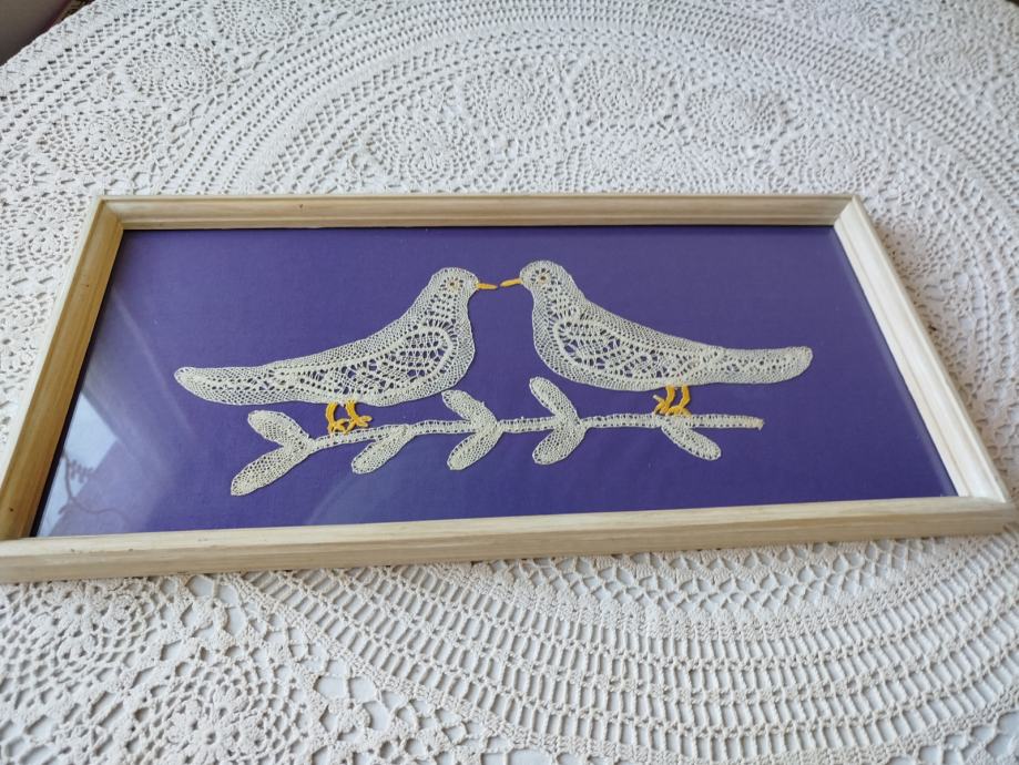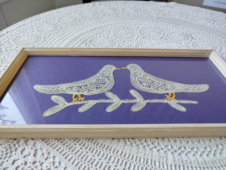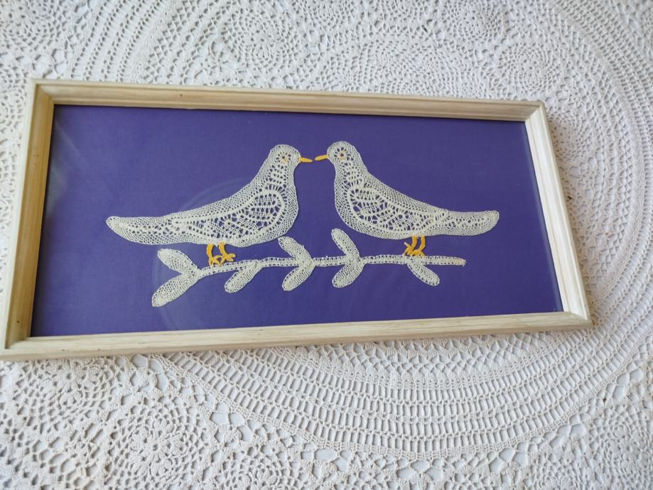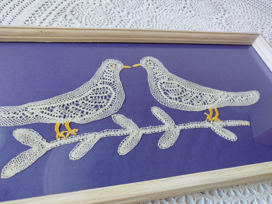 Idrijska klekljana čipka "Ptici na veji", izdelana natančno, v okvirju širine 2 cm,