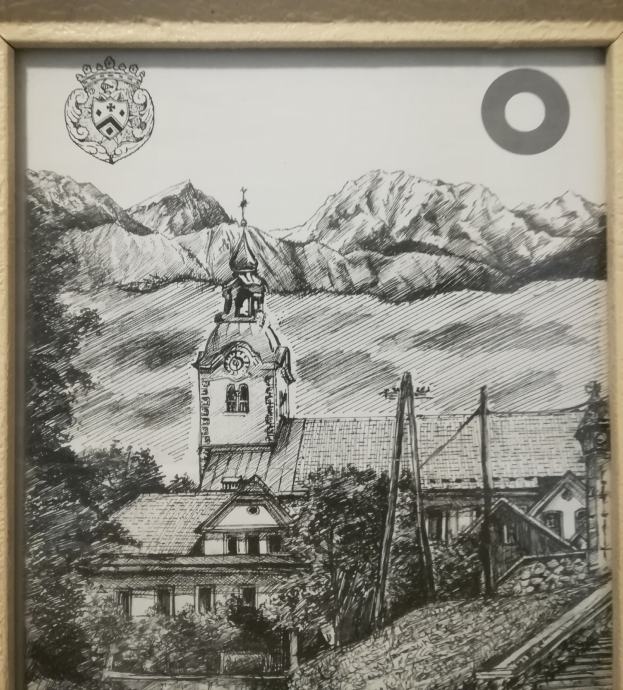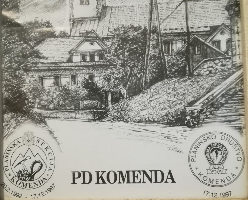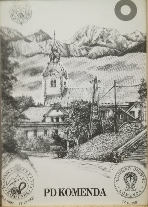 Prodam kopijo stare slike cerkve in župnišča v Komendi pri Kamniku v zasteklenem lesenem okvirju. Na sliki je tudi grb Komende in žigi Planinskega društva Komenda. Leva štampilka planinskega društva je veljala od 20. 2.1992 do 17 12.1997, desna pa od 18.12.1997 dalje.