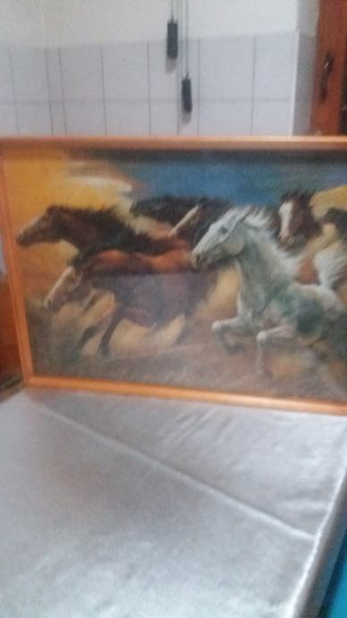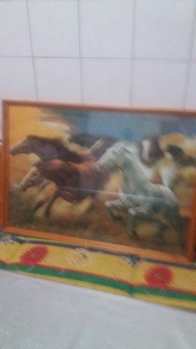Slika sestavljenka. Čreda konjev v galopu je velika ,lepa in ohranjena .Velikost 85x60 cm . Primerna tudi za darilo . Možna menjava za konjski gnoj .